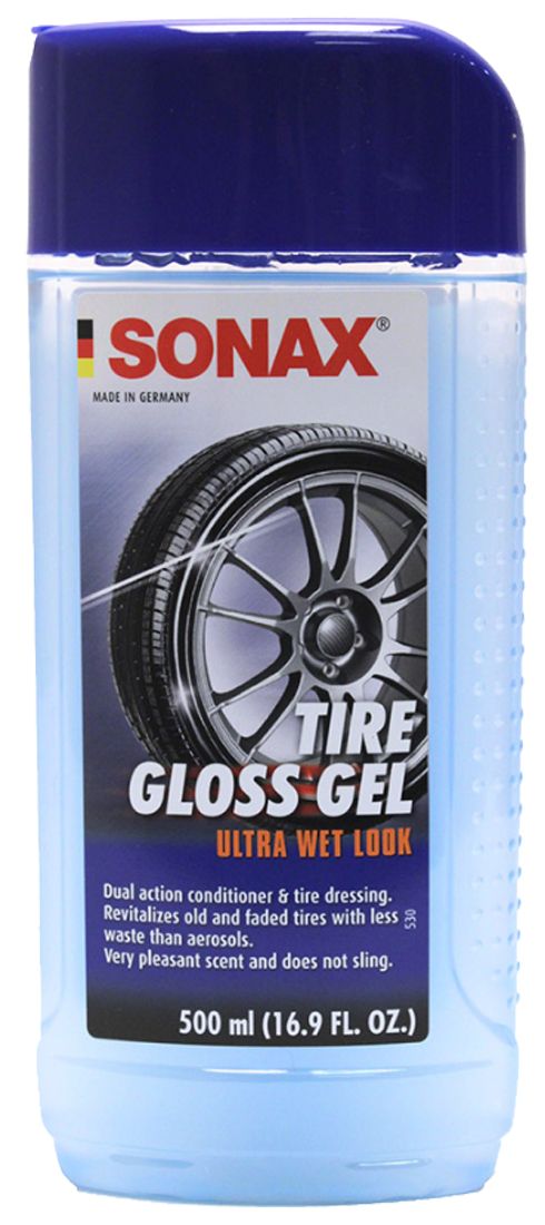 The SONAX Tire Gloss Gel is an all-new tire restoration and conditioning formula. The innovative gel formula penetrates your tires surface hydrating and revitalizing the rubber. SONAX Tire Gloss Gel is rich in specially engineered silicon, achieving an intense, semi-gloss with a fresh, clean showroom shine. Each application lasts for several weeks. One bottle of SONAX Tire Gloss Gel is sufficient for up to fifty (50) tire applications.