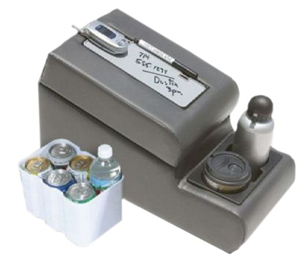 The Everyday Commuter Center Console locks to the seat of any bucket or bench seat using your vehicles seat belt. Includes a map net under the lid for easy access to your maps or note pads and an erasable writing board with pen and eraser The deep storage area fits canned drinks or a combination of plastic water bottles and comes with a "Freeze Chiller" to keep you're your beverages cold.