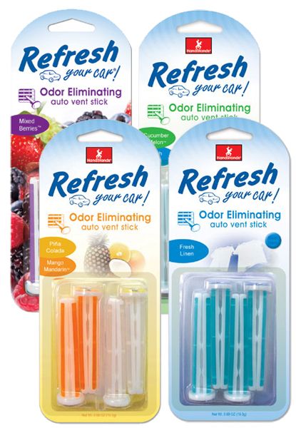 The Refresh Vent Stick Car Air Fresheners are the perfect auto accessory for people who want a fresh fragrance without calling attention to a hanging air freshener. Vent sticks air fresheners clip discretely into your vehicle's vent, using the air flow to deliver a clean and fresh scent and eliminate odors. Sold with four vent sticks per pack.