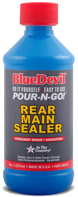 Blue Devil Rear Main Sealer permanently seals rear main leaks. Just add to engine oil to restore and seal the gaskets.
