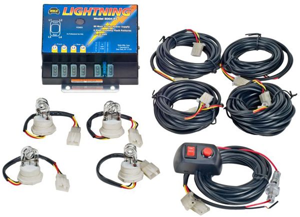 Wolo’s 8004 series emergency strobe light kits are designed for reliability and high performance, with four (4) grommet style strobe bulbs that are encapsulated in epoxy for moisture protection and to protect against road vibration. The bulbs easily install into a 1” hole, which is drilled into each headlight and taillight assembly. The power supply, 8004-PS is heavy-duty, with an operating voltage of 12-24 VDC and has four outlets producing 80-watts of output power. Engineered with a state-of-the-art field proven microprocessor, to provide years of dependable service. The power supply has a heavy-duty aluminum-mounting bracket that secures with four screws, provided. There are six (6) advanced flash patterns to choose from, which are controlled with the touch of a button from the control panel provided. The 8004 series is the perfect choice for any fire/rescue, police, ambulances or construction vehicles that require powerful hidden warning lights that will vastly increase visibility, so to be seen.