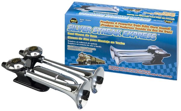A specially constructed horn built with an extra air chamber to produce a powerful train horn sound. This attractive horn produces a echo sound that replicates the horn of a speeding diesel locomotive. The trumpets of the Model 835 are entirely metal, triple chrome plate for all weather conditions. The metal mounting base secures to the vehicle with stainless steel bolts, which will provide a secure watertight installation. The air feed connection has been designed to mount easily and to be hidden from view. The Model 835 will enhance the appearance of any truck. Requires an on board air system (Wolo 800 Tiger Tank & Compressor recommended). Comes complete with all mounting hardware and air fittings. Spanish instructions included.