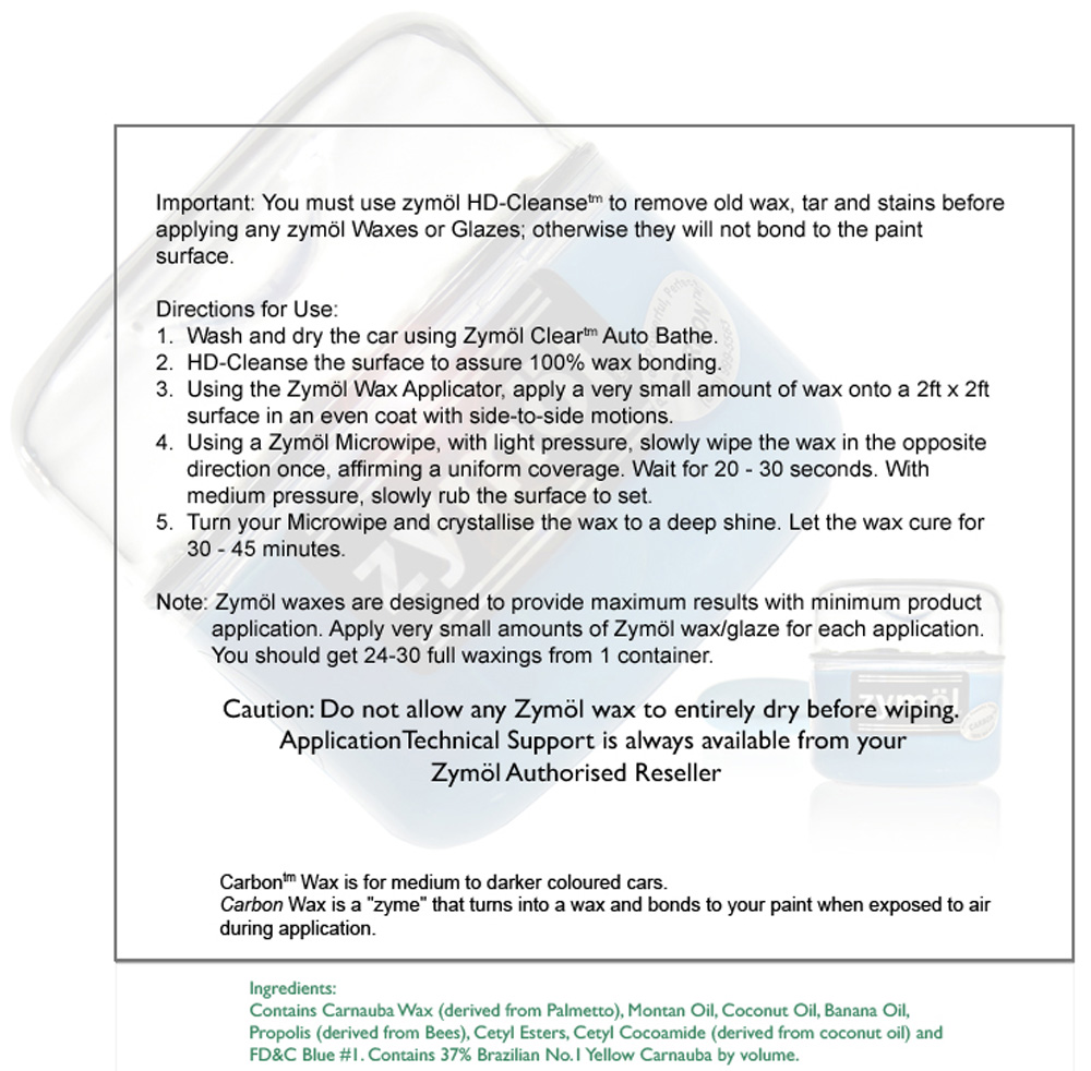 Caution: Do not allow any Zymol wax to entirely dry before wiping. You may apply several coats.Ingredients:Contains Carnauba Wax (derived from Palmetto), Montan Oil, Coconut Oil, Banana Oil, Propolis (derived from Bees), Cetyl Esters, Cetyl Cocoamide (derived from coconut oil) and FD&C Blue #1. Contains 37% Brazilian No.1 Yellow Carnauba by volume.