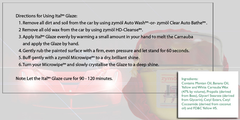 The Zymol Ital Glaze is specially formulated to protect and enhance the relatively soft paint finish of the Italian car. It was developed in cooperation with Ferrari North America, Ferrari Italy and Pininfarina, pampers and protects your high performance vehicle, plus it enriches the color of your car, providing a clarity and depth of color generally not found in the original paintwork. The Zymol Ital Estate Glaze contains the very highest grade of Brazilian No. 1 Yellow and No. 1 White Carnauba by volume (90%Yellow, 10% White) making sure your Italian car has a brilliant and longer lasting shine.