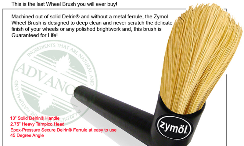 The Zymol Wheel Brush is machined out of solid Delrin and without a metal ferrule, the Zymol Wheel Brush is designed to deep clean and never scratch the delicate finish of your wheels or any polished bright work.